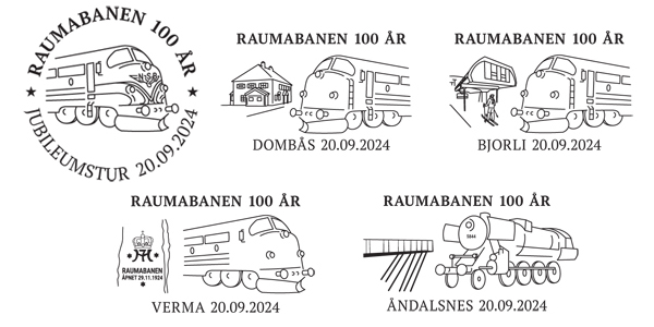 Posten tilbyr en serie med konvolutter stemplet med egne stempler både for togturen og til hvert stopp underveis. Diesellokomotivet Di 3 har vært Raumabanens arbeidshest, noe som reflekteres i flere av stemplene. I Åndalsnes-stempelet er damplokomotiv type 63a nr. 5844 gjengitt, mens stempelet for jubileumsturen viser diesellokomotivet som går først i toget.
