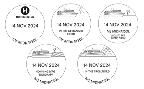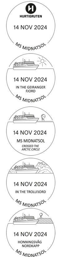 4. november 2024 NYHET Nye skipsstempler Hurtigruten MS ”Midnatsol” Dato: 14.11.2024 Sted: Crossed the arctic CircleIn the TrollfjordHonningsvåg NordkappIn the Geiranger FjordSkipsstempel Bestilling av stempler fra første bruksdag sendes Frimerketjenesten. 0