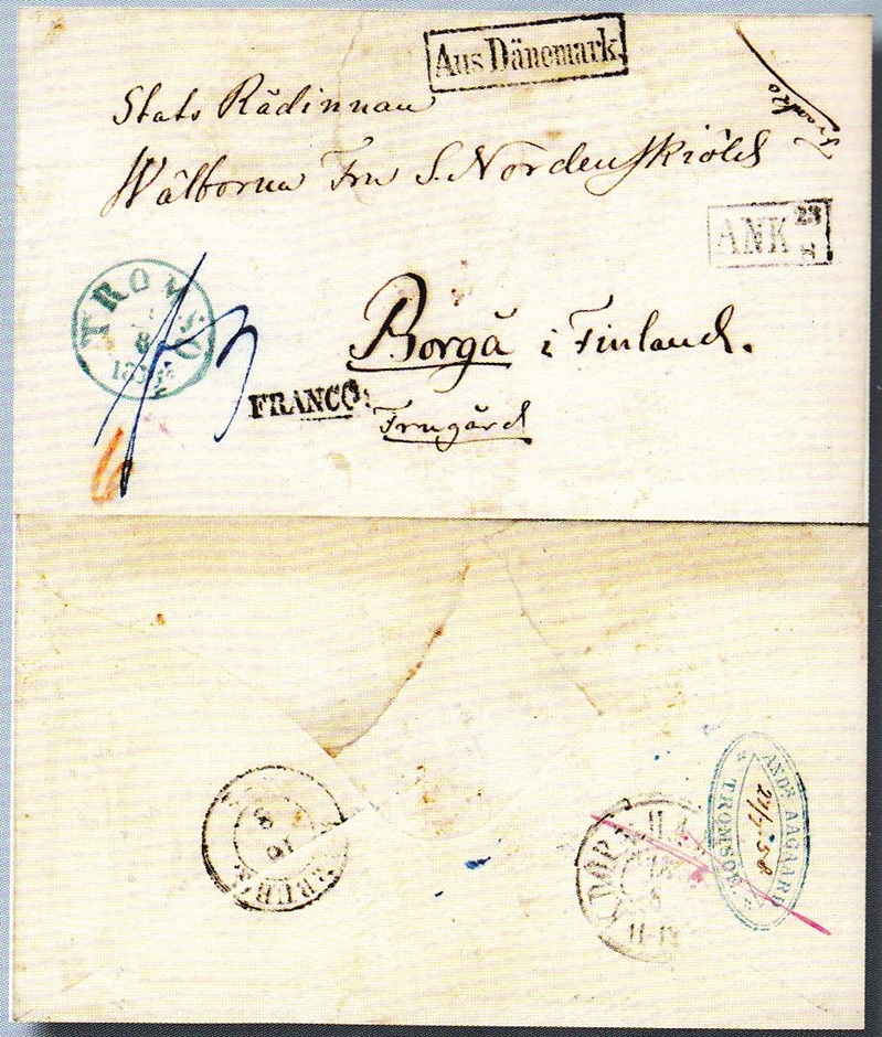 Som det fremgår av datostempler på baksiden er brevet ankommet Det Danske Postkontor i Hamburg 15/8, hvorfra det er videresendt samme dag til postkontoret i Hamburg for transittforsendelse til Åbo i Finland. Av firkantstemplet på forsiden, stemplet i Åbo, fremgår at det ankom dit 23/8, og ble så videresendt til Nordenskiølds mor på gården «Frugård» i Borga.