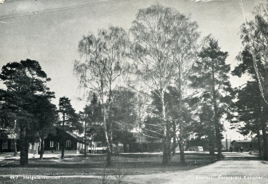 Det andre eksempelet er feltpostkontor nr.2 – Helgelandsmoen som har poststempel fra rundt 1890. Her viser jeg et kort med stempel fra 1954 med et kortmotiv som viser noen av bygningene. Her er det også begge sidene som jeg vil samle på.