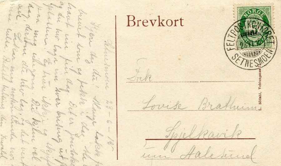 Poststempelet er kjent brukt fra tidlig på 1900. Brevkortet som her er stemplet i 1915, viser «Udsigt fra Setnesmoen, Romsdalen og Vengetinderne». Et kort hvor begge sidene er samlebare for meg.