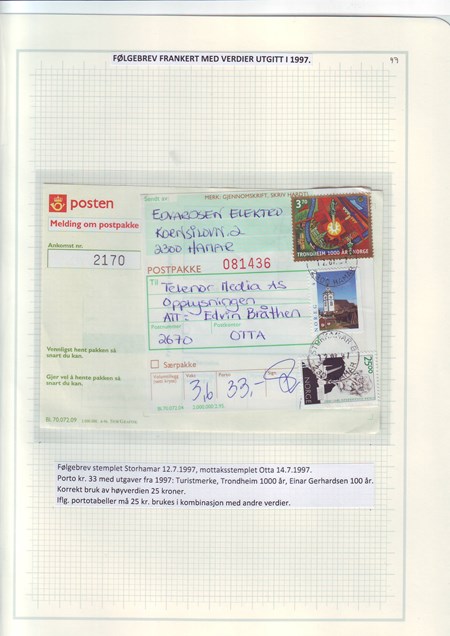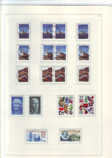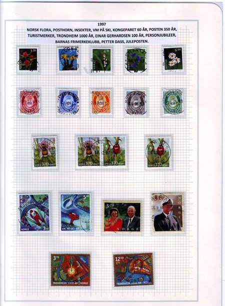 La meg gi et eksempel fra 1997 – årgangen på hvordan jeg monterer min Norgessamling. Jeg bruker ark som passer til et Leuchturmalbum og monterer først noen sider med seriene som kom ut i 1997. Som du ser av arka som er avbilda, så «pakker» jeg godt sammen på hvert ark slik at årgangens hovednummer ikke tar for mange ark. Merka setter jeg opp med klemlommer slik at jeg lett kan skifte ut om noe bedre dukker opp (Joda, jeg søker også helstempla merker). Så fyller jeg på bakover med nye ark med papirtyper, taggingstyper, varianter, hefter og sendinger med ulik porto. Egentlig kan du på denne måten utvide samlinga så langt du ønsker, og 1997 – årgangen som her er eksempelet, blir rett så mange ark i albumet.