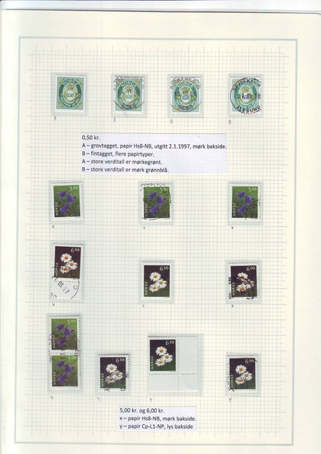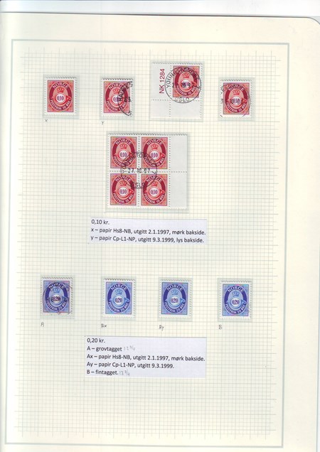 Mange ser jo 20mm som noe av det ypperste i norsk filateli, men her kan jeg anbefale moderne norske merker som et godt alternativ. Det er absolutt rimeligere, men egentlig ganske utfordrende om du ønsker å gå i dybden. Mange av merka er jo rimelig massevare som andre i klubben har liggende i posekartoteket sitt. Så her kan du bare glede deg til timer med hygge og ikke minst glede når du finner papirtyper og tagginger som du mangler i samlinga. Problemet er bare at det ofte er vanskelig å skille papirtypene etter at frimerket er vasket. Du kan få noe hjelp av stempeldatoer (Norgeskatalogen er et helt nødvendig hjelpemiddel) og andre ganger må du heller sette inn ubrukte merker. Blokker og striper med marginaldatoer er også «gefundenes fressen» for en som samler papirtyper.