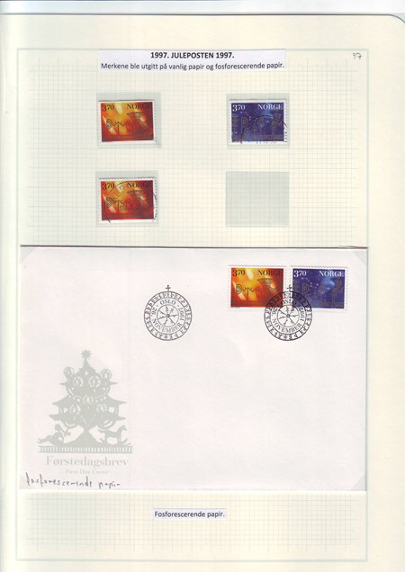Når jeg valgte 1997 – årgangen som eksempel, så er det fordi vi har de kjente julefrimerka med fosforescerende papir i denne årgangen. Historia om hvorfor en del av disse merka fikk fosforescerende papir kan være til ettertanke for den som samler moderne norske merker. Tilfeldigheter i trykkeriet fører til at en del av opplaget sendes ut med en annen papirtype enn det som skulle brukes, og min påstand er at slike tilfeldigheter fortsatt gjør seg gjeldende.